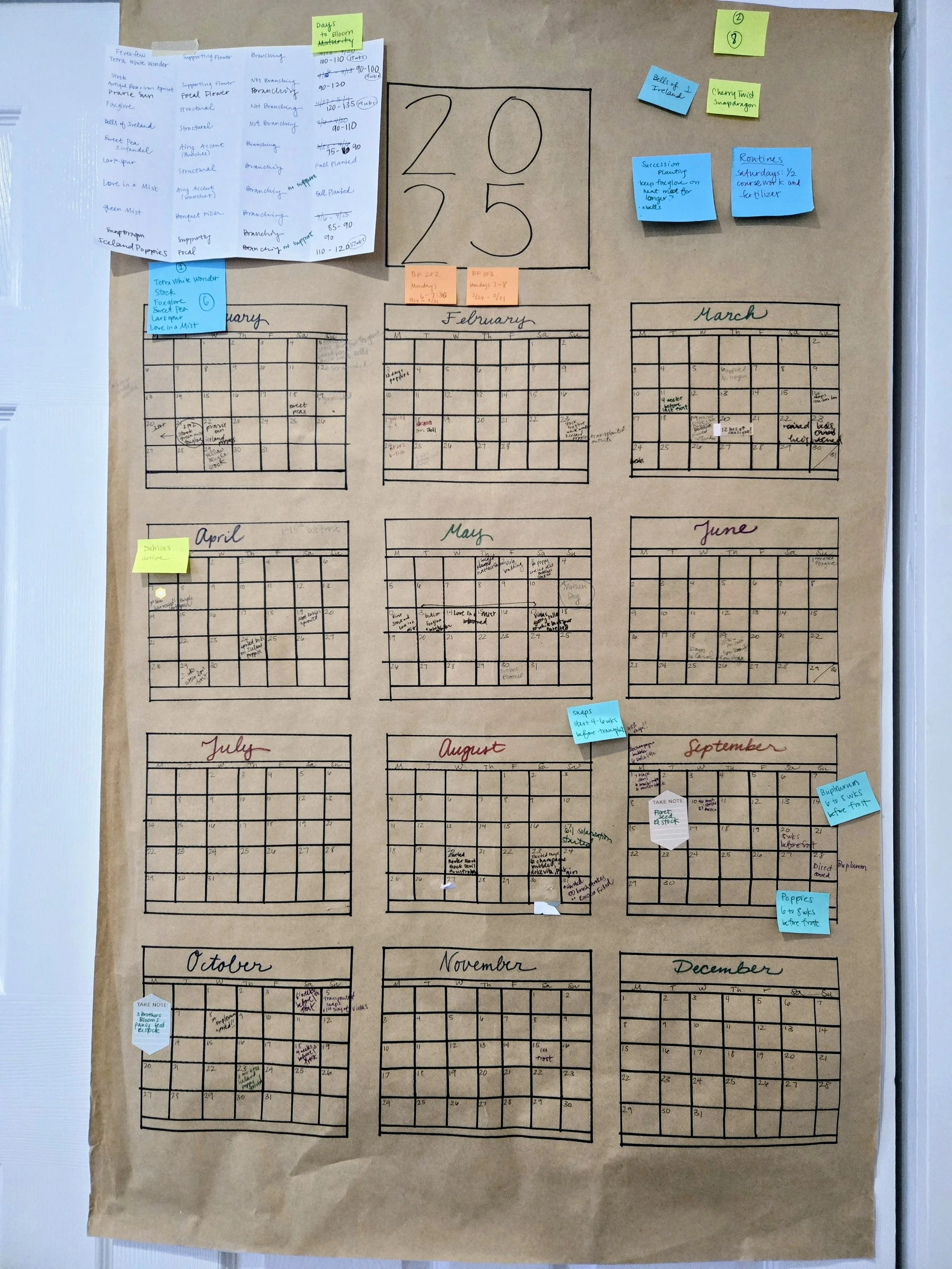 This January, I bought a roll of brown butcher paper and went at it with some pencils, sharpies, and a ruler. A few hours later, I had a complete 2025 calendar where I could look at the whole year at the same time. Counting back 6-8 weeks from my last expected frost became so much easier without navigating one month at a time on my phone. I can write down what the spring was like (long, cold, wet) or when the days lengthened to 10, then 12 hours. Most importantly, I can jot down each step of my growing journey in less than a minute. Everything from when I started seeds, the date they got transplanted outside, to harvesting the first stems. Now I know how many weeks it takes Iceland Poppies to bloom in my context.